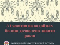 Від сьогодні, 1 жовтня, закінчилась заборона на вилов раків у рибогосподарських водних об’єктах Волинської області.