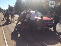 У Києві пасажири відсунули автівку, яку водій покинув на трамвайній колії. ФОТО
