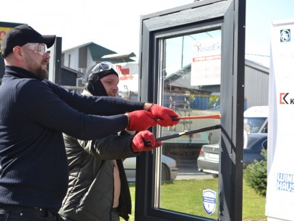 Вікно складається із самого профілю, склопакета та фурнітури. WINTERA співпрацює з потужними німецькими компаніями, кожна з яких має свої інноваційні розробки, котрі впроваджують на виробництві безпосередньо в Луцьку. Йдеться про пластик від «Profine» та фурнітуру від «Winkhaus». За якісні склопакети відповідає компанія «Lesya plus». Тож у Луцьк запросили представників партнерів WINTERA, щоб у польових умовах перевірити таку важливу характеристику вікна як зламостійкість.