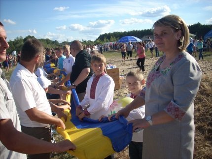 – Я не раз чув, що на березі цього прекрасного озера вже кілька років поспіль відбуваються перегони на байдарках, – сказав парламентар, звертаючись до присутніх. – Оскільки «Батьківщина молода» Волині є співорганізатором цього заходу, запропонував розгорнути тут національний стяг, який виготовила наша молодіжна організація. Він занесений до Книги рекордів України, бо є найбільшим у світі. Його площа – 2400 квадратних метрів!
