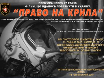 У суботу, 25-го листопада, о 14-й годині, в приміщенні актового залу Волинської державної обласної універсальної наукової бібліотеки імені Олени Пчілки за адресою місто Луцьк, вулиця Шопена, 11, відбудеться прем'єрний показ унікального документального фільму "Право на крила".