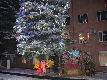 Напередодні свят біля новорічної ялинки ПрАТ «Волиньобленерго» облаштували різдвяний вертеп заввишки 2,5 метра.