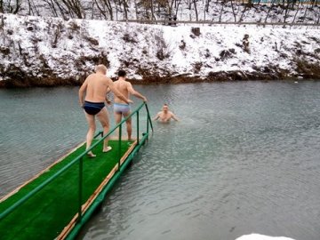 Так, тисячі українців цього дня пірнають у крижану воду природних водойм. Не стали винятком і працівники Луцького НТУ на чолі з ректором Петром Савчуком, які тричі занурювалися з головою у джерельну воду в Баєві (село під Луцьком, - ред.).