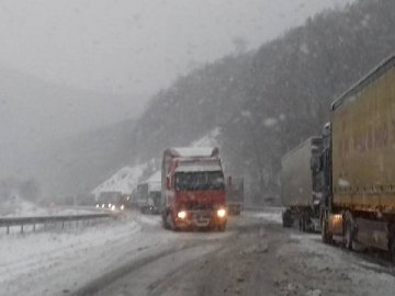 Вимушено зустрічною смугою рухаються водії легковиків на перевалах Закарпаття. Законну смугу для руху зайняли вантажівки. Фури буксують у снігу. Затор розтягнувся на багато кілометрів.
