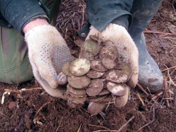 Спочатку витягнув клаптики напівзотлілої лляної тканини. Під нею побачив доволі великі кружальця, ще подумав тоді, що вони за розміром більші, як радянські карбованці. Аж тоді роззирнувся на всі боки, бо вже підсвідомо зрозумів, що знайшов скарб. Розгрібши землю, Володимир побачив, що тих монет чимало, а оскільки ніякої торби з собою не мав, то поскладав скарб у картуз.