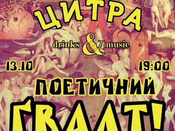 13 жовтня о 19:00 у джаз-клубі «Цитра» відбудеться епатажне поетичне дійство «ҐВАЛТ!», у котрому літератори зі всієї України роздаватимуть стусани віршами без прикрас.