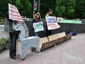 Для того, щоб заохотити залізницю до роботи активісти подарували управлінню три картонні «вагони» й картонного коня.