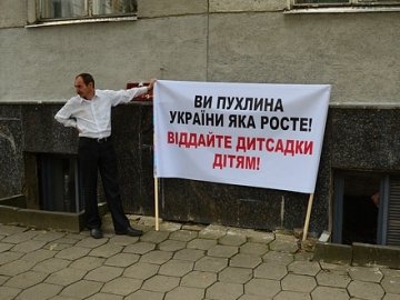 У Луцьку на вулиці Лесі Українки - акція протесту, у якій бере участь одна людина: чоловік стоїть з плакатом, на якому написаний заклик: «Віддайте дитсадки дітям!»
