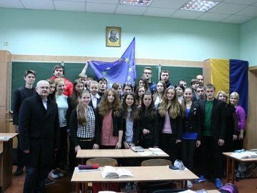 Прапор дістався учням 9-В класу цієї школи. Як розповів член Координаційного комітету Євромайдану у Луцьку Володимир Пащенко, учні цього класу активно брали участь в акціях протесту. Тож активісти вирішили вручити їм прапор ЄС – той, під яким відбувалися акції за євроінтеграцію у місті.