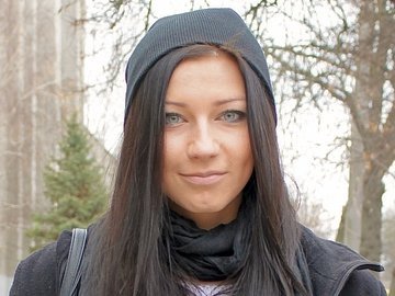 гарна, волосся багато, але пальто в "катишках" з цим шаліком виглядає досить неохайно, ну коротьше, дівчьонка природньо гарнюня - але вибачте, в "лахмітті"