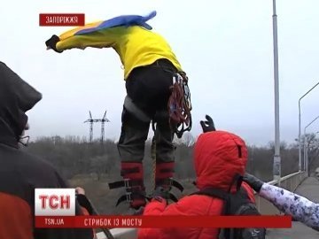 Але усталену традицію екстремальних стрибків 31 грудня запоріжці таки не порушили – висоту підкорював Дід Мороз. Він з українським прапором видерся на міст і виконав наказ однодумців – з'єднати Схід та Захід України.