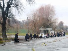 Траурний кортеж зустрічали коридором шани жителі громади, які на колінах покладали квіти перед автомобілем з домовиною земляка.