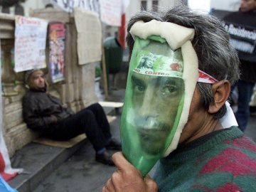 Липень 2000-го. Заворушення в Лімі. Один із протестувальників в саморобній захисній масці з пластикової бутилки.
