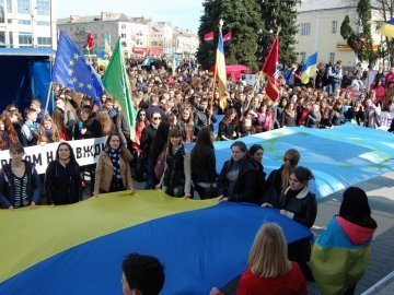 Приблизно тисяча студентів з луцьких вишів зібралися на віче, аби відзначити підписання політичної частини Угоди про Асоціацію з Євросоюзом.