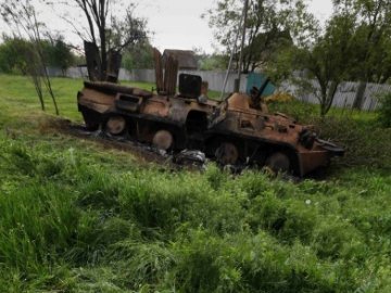 Про бойові дії поблизу села Октябрське, які проходили 13 травня, тепер нагадують залишки вщент згорілого БТРу, військової вантажівки та залишки мінометних снарядів.