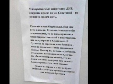 Відзначимо, що в соціальних мережах дійсно з'явилися фотографії листівок із закликами до прихильників ЛНР зняти барикади і звільнити місто.