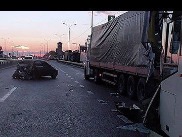 Їхали колоною із 40 машин у супроводі Державтоінспекції. Між автобусами з другорядної дороги намагався проскочити легковик "Фольксваґен". Але, за попередніми даними, не розрахував швидкості.