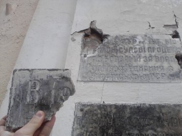 Цікаво, що розташована нижче меморіальна дошка, яка розповідає про встановлення радянської влади в Луцьку, ціла.