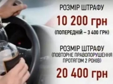 За водіння в нетверезому стані перший штраф складе 10 200 грн плюс позбавлення права керування на один рік. Удруге штраф за таке правопорушення вже складатиме 20 400 грн і три роки без права керування автомобілем.