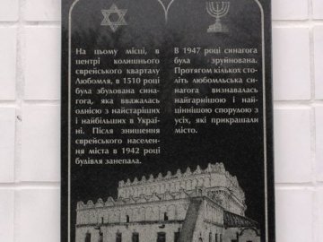 Юрій Фініковський зазначає, що меморіальну дошку єврейській общині Любомля урочисто відкрили на місці, де раніше була розташована Велика єврейська синагога. Дійство відбулось за сприяння Волинської релігійної громади прогресивного іудаїзму.