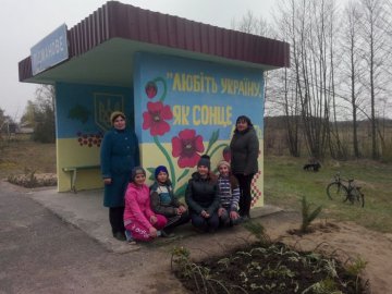 Діти разом із своїми старшими наставниками пофарбували зупинку в жовто-блакитні кольори, розмалювали її стіни червоними маками, знайшлося місце і для державного символа – тризуба, для фрагменту вишиванки і патріотичних написів, у тому числі і авторства Тараса Шевченка.