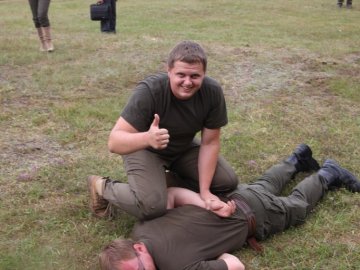 На березі озера Озюрко майор поліції, викладач тактичної підготовки Волинського навчального центру Роман Чечотка нагадав лісоохоронцям основи самозахисту.
