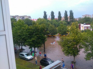 У Луцьку після сильної зливи затопило окремі вулиці. Це змусило людей пересісти на надувні човни.