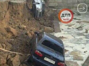 На столичній Борщагівці у Києві після сильної зливи провалився ґрунт. В утворену яму провалилися кілька автомобілів.