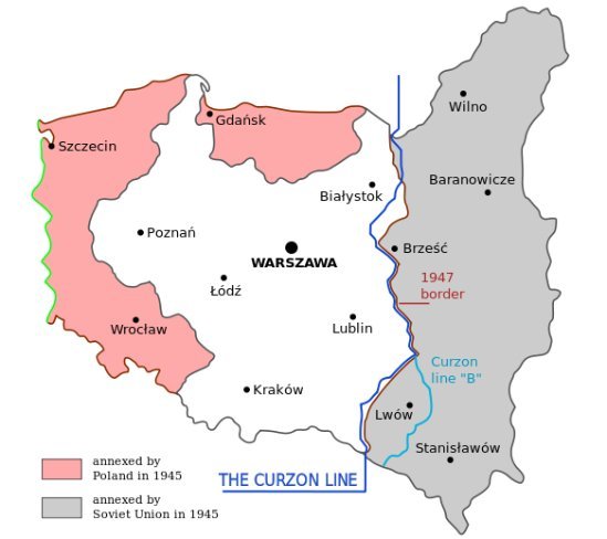 На Тегеранській конференції 28.11.-1.12.1943 р., за наполяганням Сталіна кордони Польщі визначалися на заході за річками Одер (Одра) та Ніса (Нейсе) за рахунок території Німеччини, а на сході - «лінією Керзона», яка розділяла території з переважно польським населенням, та землі східних слов’ян. Ця лінія була запропонована міністром закордонних справ Великобританії Д.Керзоном ще у грудні 1919 року як кордон між Польщею і Радянською Росією і майже співпадала з кордоном СРСР 1939 року, після розділу Польщі. Пропозиції Сталіна були підтримані Черчіллем, який розумів, що у цьому питанні СРСР не поступиться. Він зауважив, що землі на захід від Польщі набагато кращі земель, яких вона віддає.
