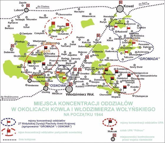 На території Волині акція «Буря» почалася з наказу коменданта Волинського округу Армії Крайової від 6.01.1944 р. про концентрацію сил у західній частині Волині. Штаб округу знаходився у с.Купичів Турійського району, пізніше у с.Сушибаба. 15 січня штаб оголосив акцію «Буря на Волині», а 28 січня було прийняте рішення про організацію піхотної дивізії. У її рамках утворювалися два полки – «Gromada» біля Ковеля і «Osnowa» у районі Володимира-Волинського. З Варшави прибула діверсійно-саперна група у кількості 20 чоловік.