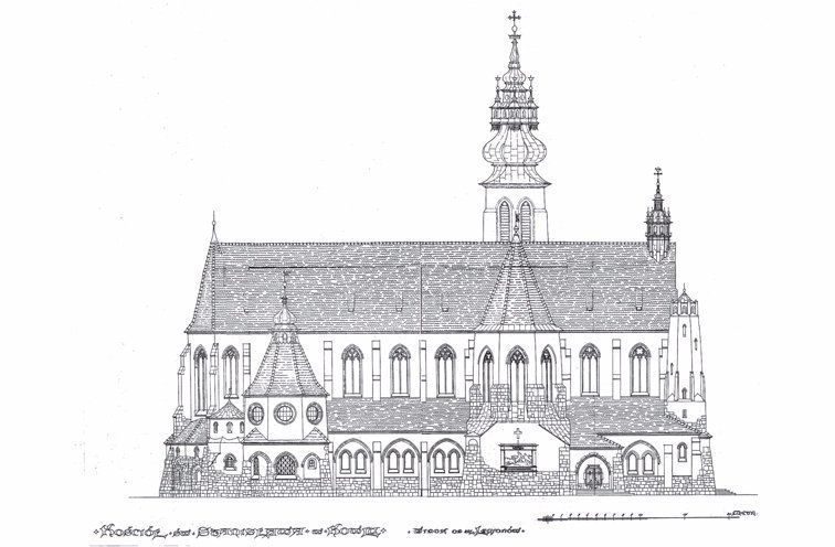 Йому вдалося синтезувати готичні та барокові елементи, модернізовані до сучасних стилізацій. Загальний вигляд костелу мав асиметричні риси – до високого даху центральної частини гармонічно прилягали ярусні башти, башточки і каплиці, кожна з різноманітними дахами і дашками. Штучно розширені тесаними гранітними блоками біля основи стіни створювали враження непохитної грунтовності будівлі. Триярусна башта з південної сторони костелу завершалася «шоломом», обрамленим чотирма башточками – традиційними елементами народного храмового будівництва.