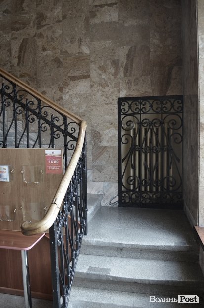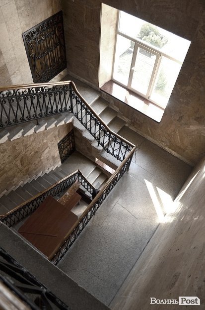 Одна з найцікавіших частин приміщення – центральні гвинтоподібні сходи між поверхами, де збереглися довоєнні гратки, зроблені без використання зварювання