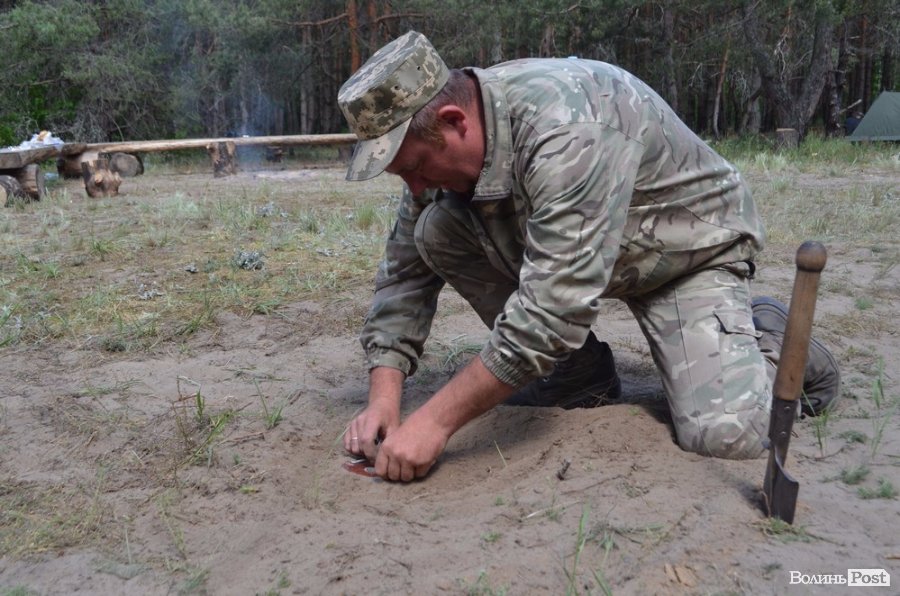 Олександ Денік із Любешівського військкомату демонстрував отримані навички із встановлення протипіхотної міни з «секретом».