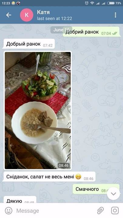 Також дівчина радіє, що ті «мізерні» порції, що тренер «приписав» уже дають відчуття ситності, а відчуття голоду зникло зовсім. Катя вважає, що такий результат є завдяки перекусам, які є обов'язковими в 5-разовому режимі харчування.