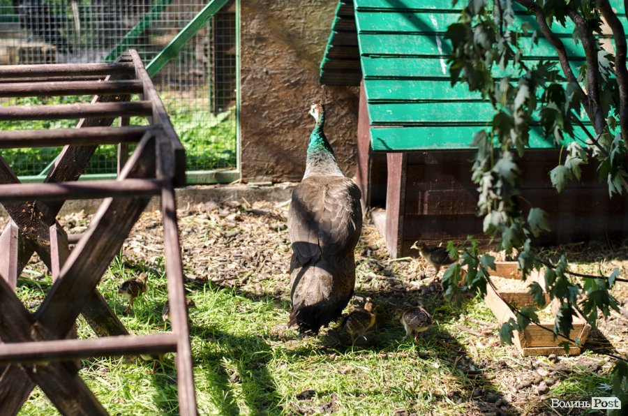 Маленькі павичі дуже схожі на індичат. І не відразу віриться, що пройде трохи часу, і вони граційно розпускатимуть хвости, та привертатимуть увагу відвідувачів. Наразі це маленькі сірі курчата, які носяться за своєю мамою вольєром, та шукають хробаків.