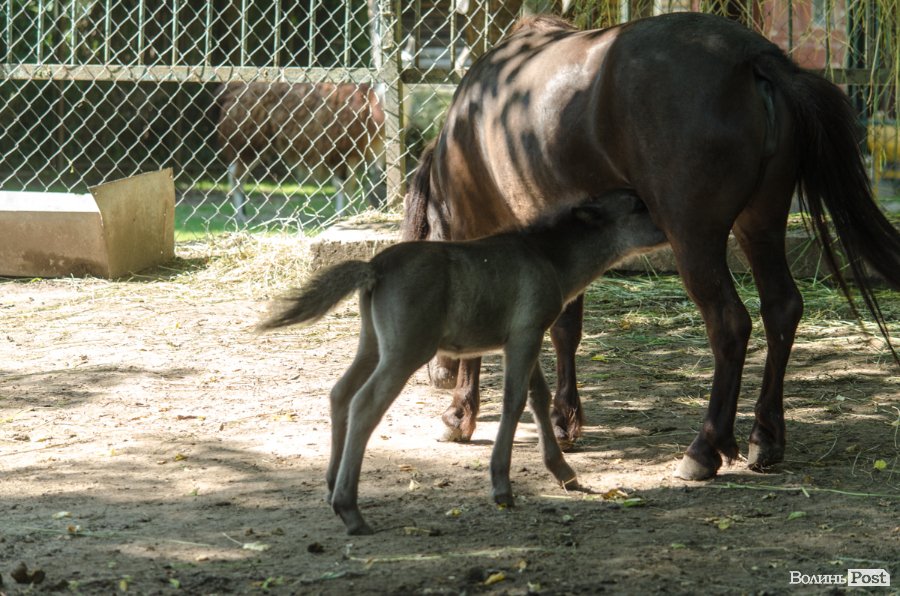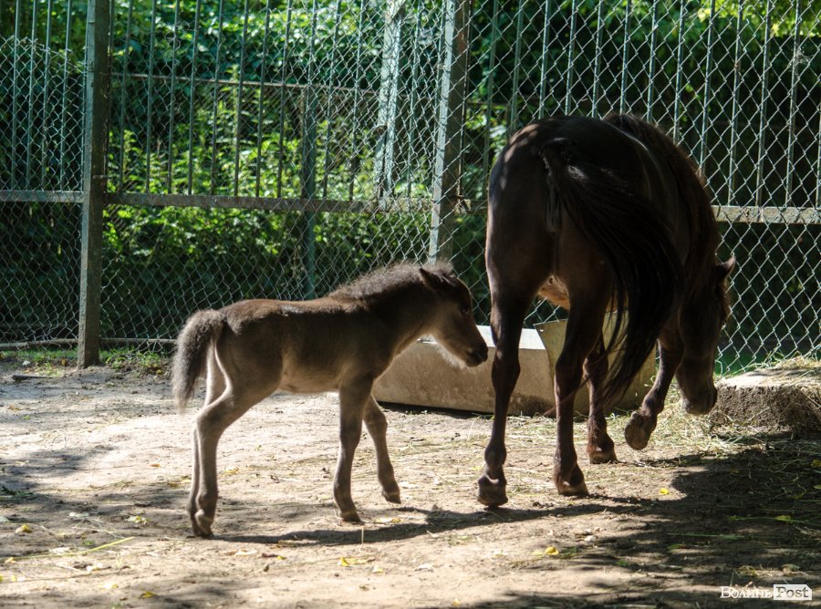 - В нас спочатку було два самці. Потім до нас з Миколаївського зоопарку приїхала самочка поні. І ми лишили її з одним коником. Через деякий час вона завагітніла. Поні зазвичай виношують дитинча десь до року. їх сину - тиждень, але він вже гарно стоїть на ногах. Фактично на наступний день після народження вже намагався ходити. На третій день вже бігав по вольєру, - розповідає працівниці зоопарку Олена.