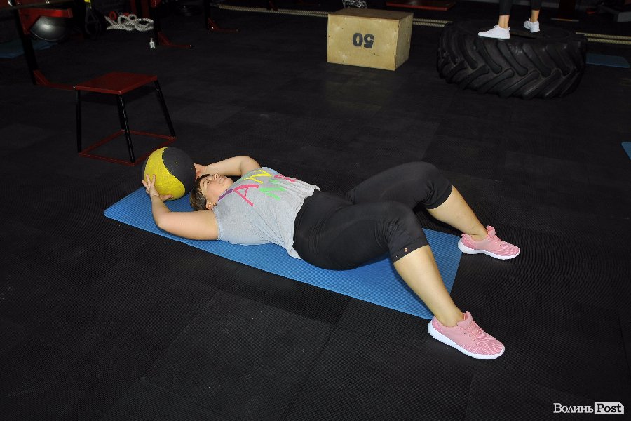 1. Прес з м'ячем - 15 разів (у Богдани - 7 кілограмовий м'яч, у Каті - 6)