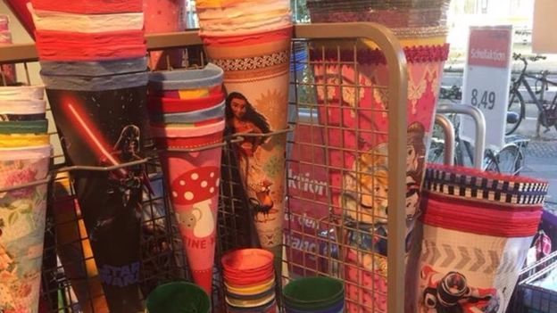 Першачки несуть Schultüte (шкільний пакет) - великий різнокольоровий картонний конус з солодощами, канцтоварами, іграшками, який дарують батьки.