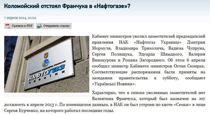 Джерела, наближені до учасників подій, розповідають, що саме Ігор Валерійович, а точніше – його увага і прихильність – стали яблуком розбрату між колишніми друзями Палицею і Франчуком. У 2009 році Коломойський «проштовхнув» кандидатуру Валерія Франчука на посаду заступника голови «Нафтогазу». Ціною призначення нібито стала домовленість про підтримку тодішньої прем’єрки Юлії Тимошенко телеканалом «1+1».
