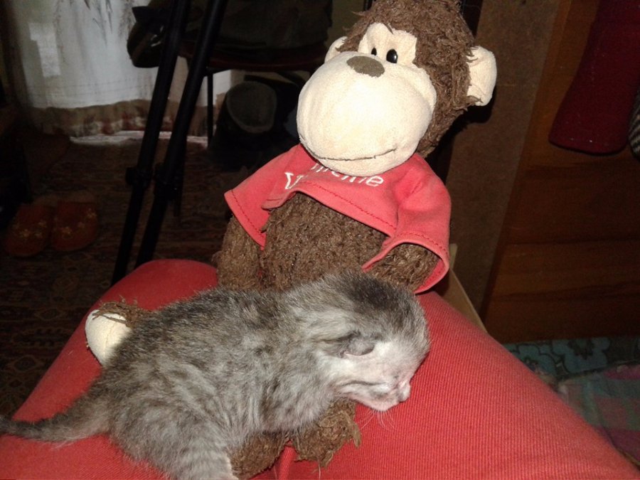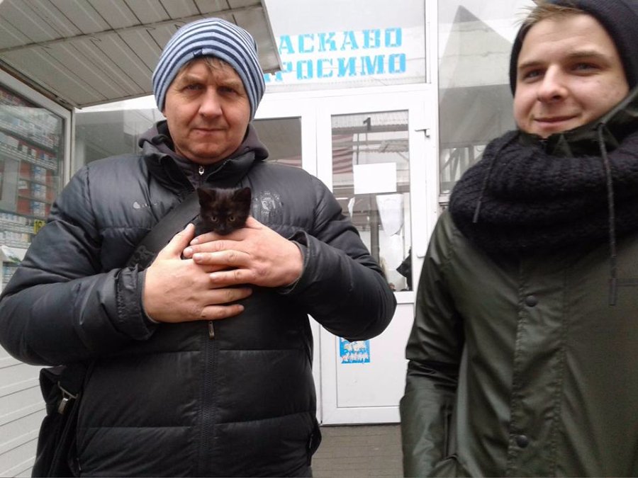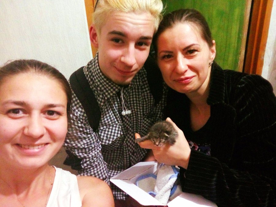 «Гуляли сьогодні із донькою Софійкою у пісочниці. А там зовсім поряд сміттєві баки (ну то так прийнято, біля дітей сміття *sarcasm*). Наскільки ми потім зрозуміли, хтось залишив декількаденне кошеня в коробці. Ішов дядько (який частенько так шариться по смітниках і збирає картонні вироби, потім здає їх і класно так "надихається" алкоголем зі своїм дружбаном у підвалі сусіднього будинку), побачив коробку, заглянув у коробку, вишвирнув звідти оцей згорток, коробку забрав, пішов. Залишити там не змогла. Кошеня таке мале, що поміщається в долоні. Ще очі не розплющило. Його забрали Люба і Едік. Мої герої. Люди, які зробили моє життя трішки спокійнішим. Люди, які зробили одне маленьке життя потрібним і щасливим. Вони прийшли до сусідів в гості і почули, що пищить котеня. Думали, хтось поїхав і зачинив кота самого. Я коротко розповіла їм історію, і що ви думаєте - Едік каже: «Мам, давай его возьмем. Может, его наша кошка примет» Так кошеня знайшло собі постійний дім».