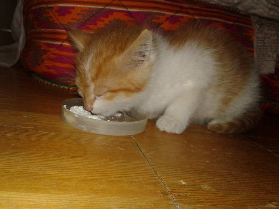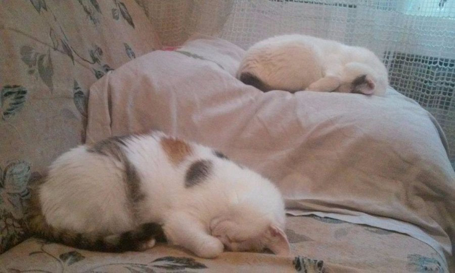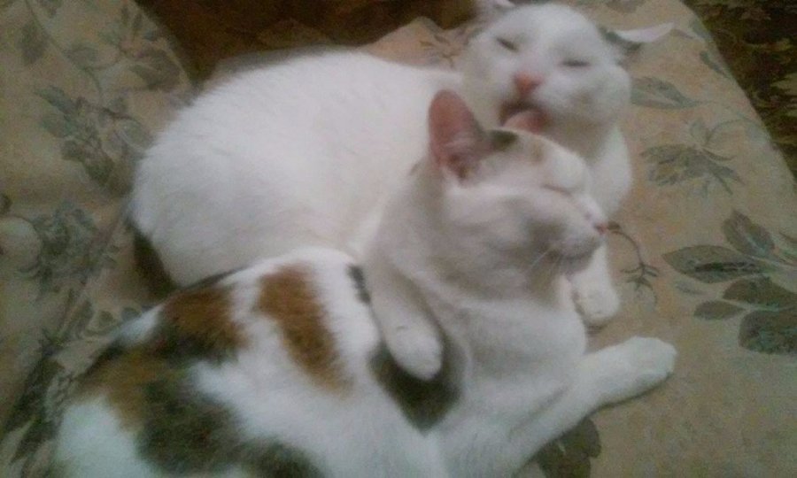 «Довелось виводити тисячі бліх, лікувати очі і чекати, поки заживе зламана лапа. На диво, кицька навіть не страждала від вимушеного ув'язнення. У перші дні вона тільки спала, їла і муркала на руках. Коли ж настав час її випускати до старшого кота, виявилось, що те п'ятикілограмове чудовисько боїться малого кошеняти. Спершу хотіли кицьку прилаштувати, але вони з котом подружились, та й бажаючих на неї не було, тому вирішили залишити. Тепер це дружня сімейка, яка гріє і вмиває один одного, а ще - разом перевертає вазони. P.S. Ніколи не хотіла білого кота, але доля вирішила інакше», - додає дівчина.