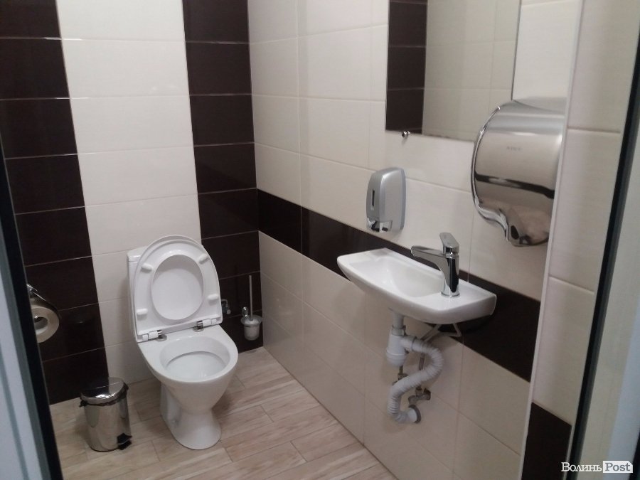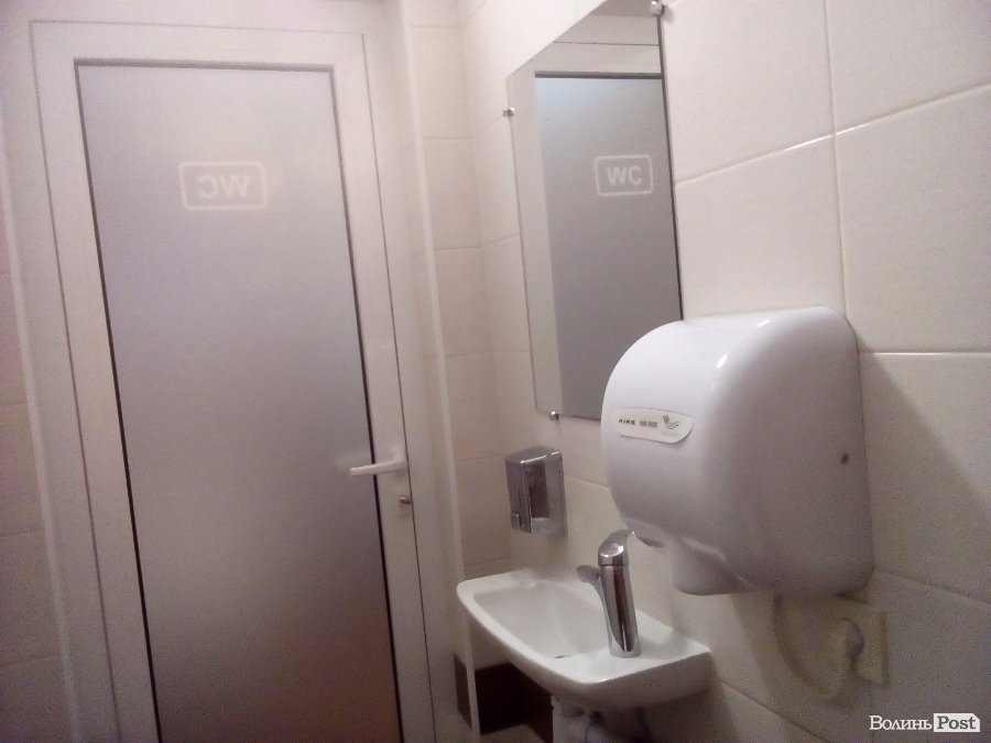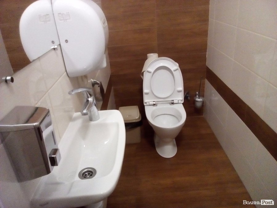 У чоловічій вбиральні все у сірих тонах, жіноча – «гламурніша», вона червоного кольору.