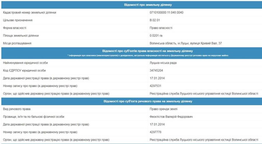 Із 2014 року ця земельна ділянка площею 0,02 га належить Феоктісову Валерію Федоровичу. Він є сватом луцького бізнесмена Станіслава Шайка, який разом із депутатом Валерієм Бондаруком тримають мережу аптек «Волиньфарм». Як відомо, батьківщинівець Валерій Бондарук у Луцькій міській раді входить до групи прихильників політики УКРОПа та Ігоря Палиці.