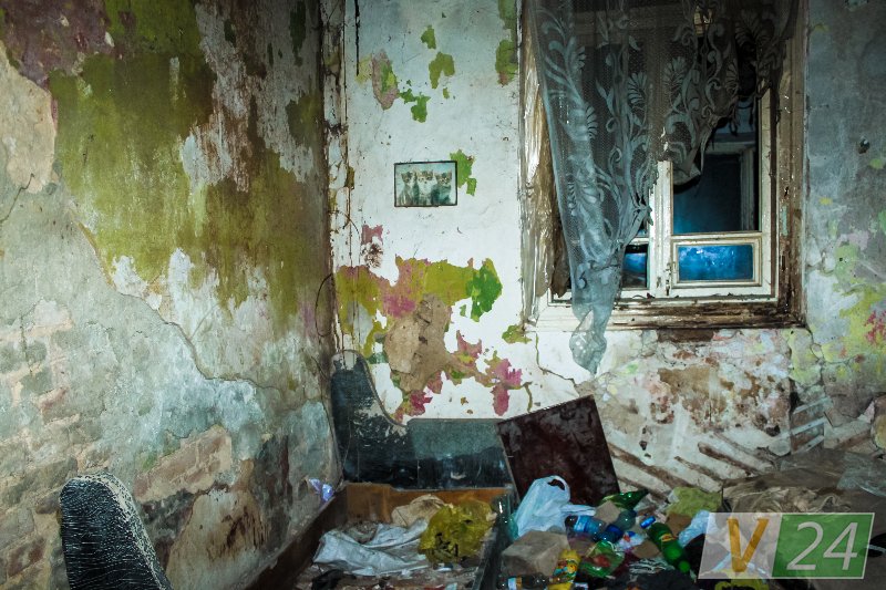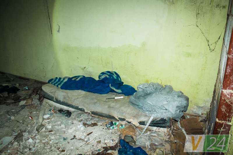 Цього разу тут було порожньо. Але хата на вигляд дуже навіть «обжита». Підлога встелена лахміттям. По кутках – лежанки для ночівлі з чорних і смердючих матраців. На одному з них біліє кухонний ніж. Така-сяка грубка доживає віку. На ній дві тарілки. У заглибині помічаємо кілька шприців.