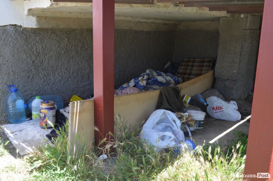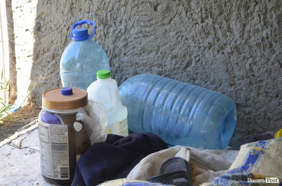 Своє маленьке «обійстя» у Луцьку Стасюк облаштував, з чого було – старий одяг і речі, які приносять незнайомі люди, великі пляшки з води, літні тапочки. Має імпровізовану подушку із сидіння та справжню ковдру, яку весною, коли безхатько ще міг нормально ходити, дали віруючі – пригадує, що тоді йому привезли багато «гуманітарки». До того, попри весняний холод, він вкривався тільки тонким покривалом.