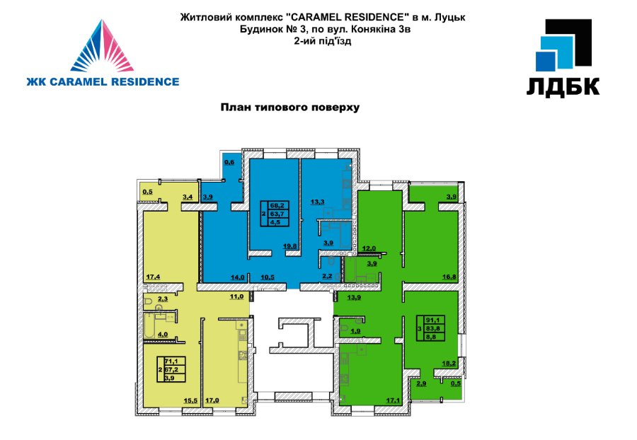 У другому під’їзді третього будинку ЖК «Caramel Residence» на кожному поверсі лише три квартири - дві двокімнатні та трьохкімнатна квартири на поверсі. Двокімнатна квартира на 72 м2 має величезну кухню – 17 м2, яку можна зонувати, перетворивши помешкання на трикімнатне. Туалет та ванна розташовані в окремих приміщеннях. Затишна спальня розташувалася на 16 м2. Для тих, хто любить яскраво організовувати своє дозвілля, влаштовувати кіноперегляди чи приймати гостей, передбачили просторий зал площею 18 м2. Із залу можна вийти на лоджію.