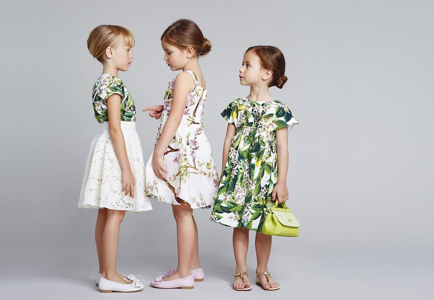 Для дівчаток. У цьому сезоні переважають сукні трапецієподібної форми з рукавами-ліхтариками, сарафани із завищеною талією, пишні спідниці з декількох шарів напівпрозорої тканини. Популярні квіткові орнаменти, етнічні візерунки, великий декор в стилі дитячих малюнків. Для повсякденних образів характерна проста елегантність прямих трикотажних суконь або легких тунік, а також приталені фасони з контрастним поясом, спідниці з оборками або великими кишенями, джинсовий комбінезон з шортами. Моделі в стилі “Маленька принцеса” тепер позбавлені блискучого декору і прикрашені квітами з тканини, ажурними мереживними вставками, розширеним донизу подолом або пишним воланом з декількох шарів. Ошатний образ обов'язково доповнювати мініатюрною сумочкою, декоративною заколкою або обручем, які відповідають колориту одягу.