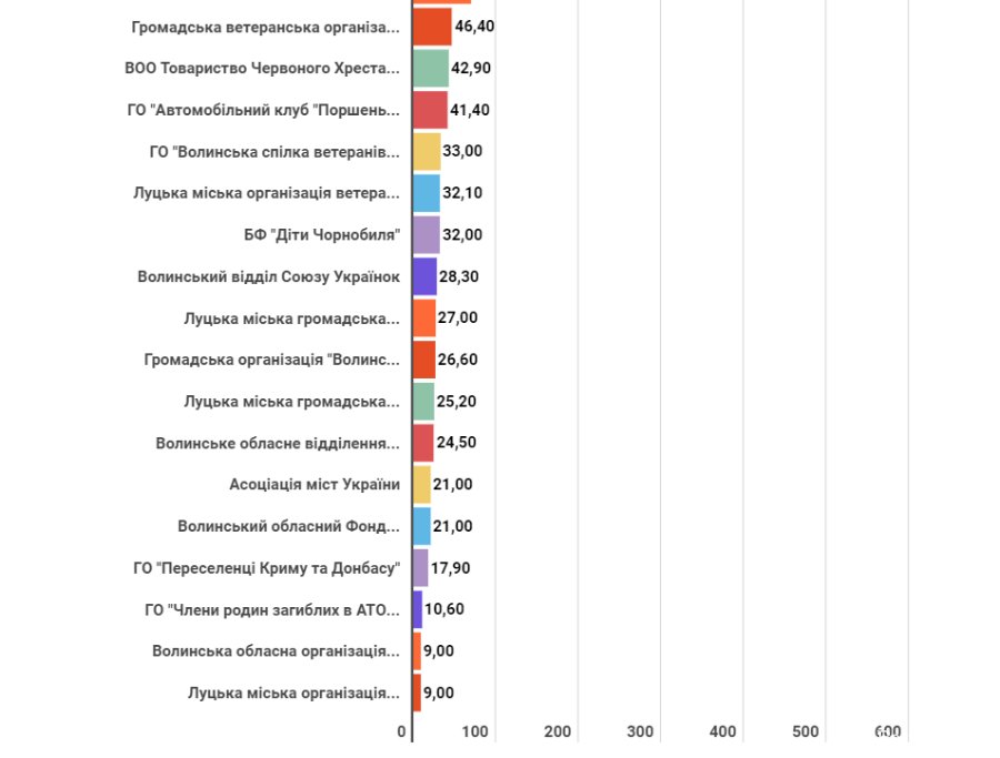 Найскромніші комунальні офіси у ГО «Члени родин загиблих в АТО «Надія» – 10 кв.м., Волинської обласної організації Всеукраїнського жіночого товариства імені Олени Теліги – 9 кв.м. та Луцької міської організації Всеукраїнського об'єднання ветеранів – теж 9 кв.м.