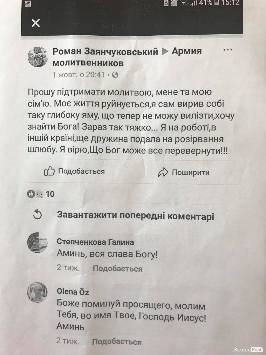 Випадково Світлана Заянчуковська дізналася й про ще одну аферу – Роман розмістив у соцмережі допис з проханням допомогти грішми їй же, «хворій та вагітній».