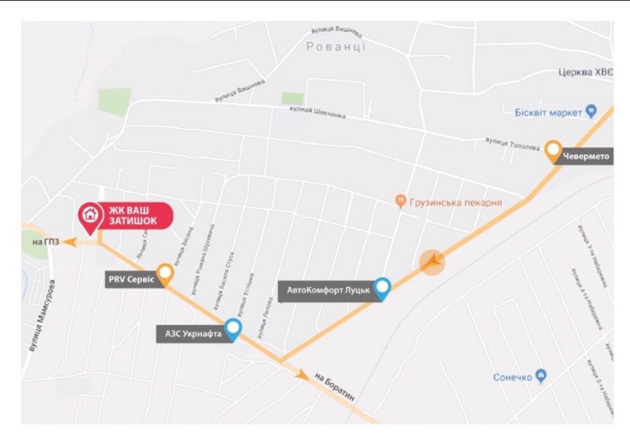 ЖК «Ваш Затишок» розташувався у затишному місці на околиці Луцька. Згідно проекту забудови тут зведуть 2 будинки на 10 окремих дворівневих квартир. Загальна площа такого таунхауса становить 116,95 м. кв., житлова – 60,73 м. кв.